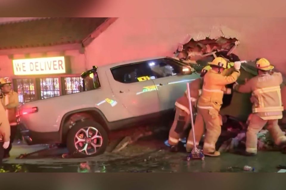 The Rivian then crashed into the wall of Raffalo’s Pizza and landed in the bathrooms.