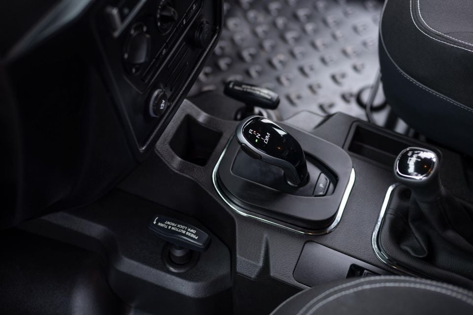 The electric motor itself occupies the space the transmission used to fill. The motor still drives all four wheels through a two-speed transfer case with high and low ranges, and a manually selectable part-time four-wheel drive system.