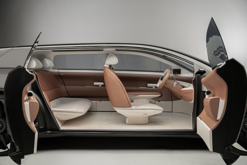 The lack of a traditional b-pillar and the rear-hinged back doors offer a vast aperture into the minimalist cabin, which aside from the side-mirror-replacing camera display lacks interior touchscreens to “create a stress-free environment for the mind and soul”.