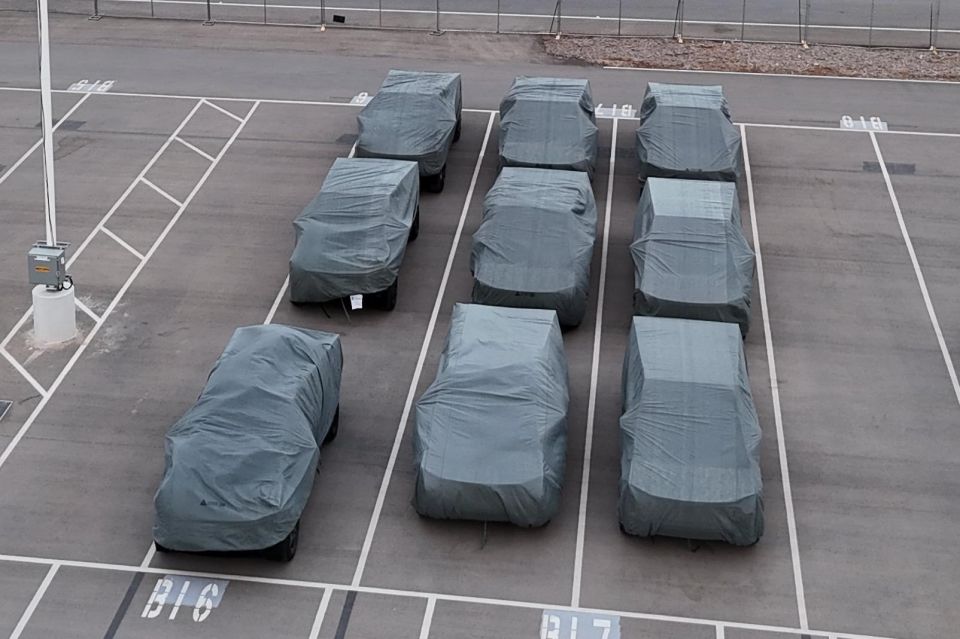 The vehicles are covered in a grey cover and – according to Joe Tegtmeyer’s post on X, formerly known as Twitter – they were parked in the transportation lot next to a couple of Tesla Model Ys.