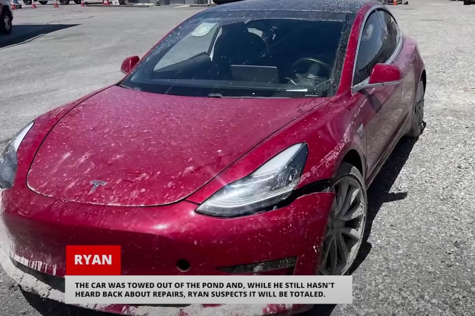 A driver known simply as Ryan shared dashcam footage with YouTube channel Wham Baam Teslacam of their Model 3 veering off into floodwaters while using the FSD Beta, causing the vehicle to likely be written off.