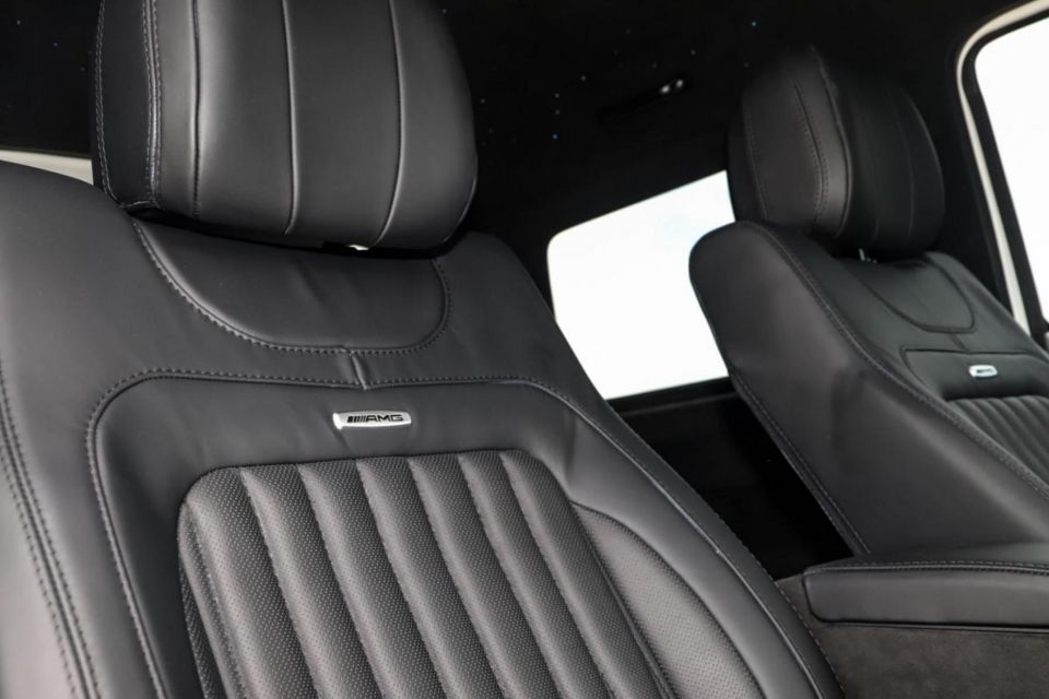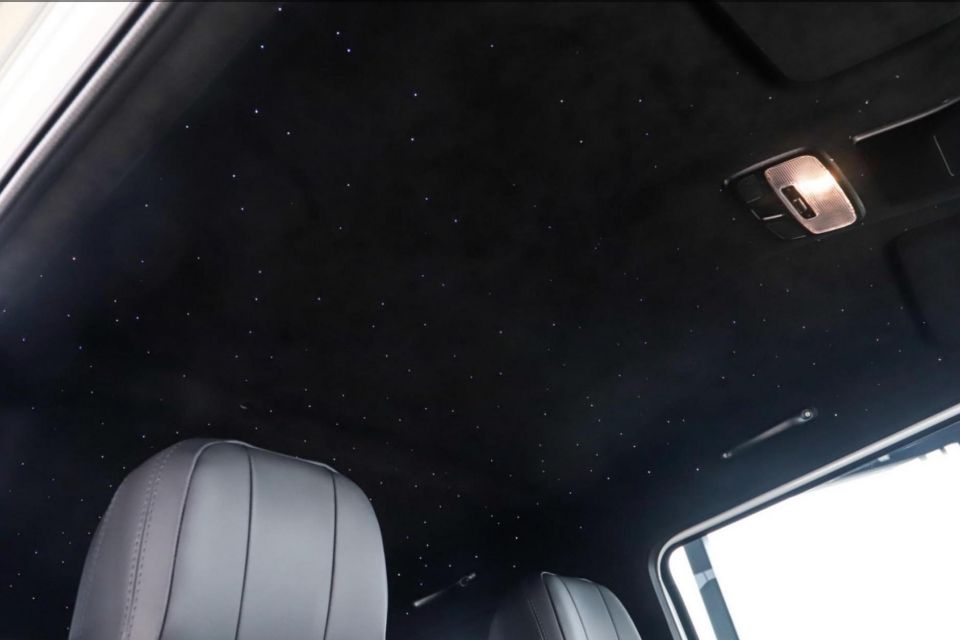 The interior features lookalike air vents, a Mercedes badge on the steering wheel, leather seats with AMG logos, and ‘stars in the ceiling’.