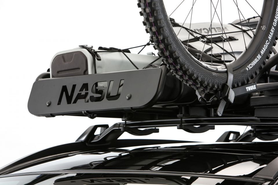 Up top there’s a cargo tray and an articulating roof rack, which can accommodate the custom downhill mountain bike that accompanies the concept car.