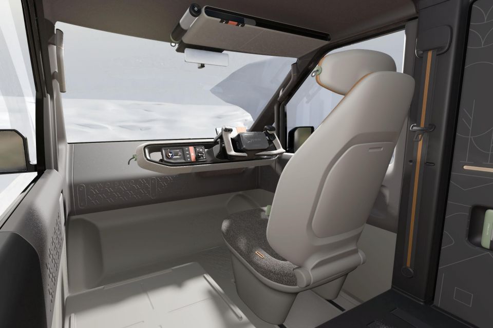 There’s also a full-width infotainment and instrumentation display along the base of the windscreen, and a simple dashboard pod with physical climate controls, transmission shifter, and a flat-bottom two-spoke steering wheel. Fabric is used on the dashboard pod, steering wheel and seats.