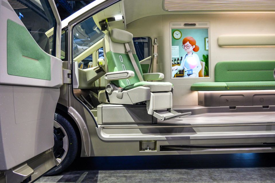 There were multiple variants of the HiAce Concept at Toyota’s stand. One was set up as a rolling medical centre with a comfy green couch, a large screen for a virtual medical assistant, and a swivelling passenger chair that doubles as an examination chair.
