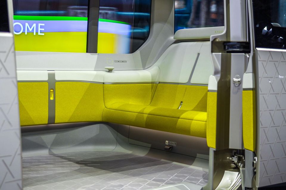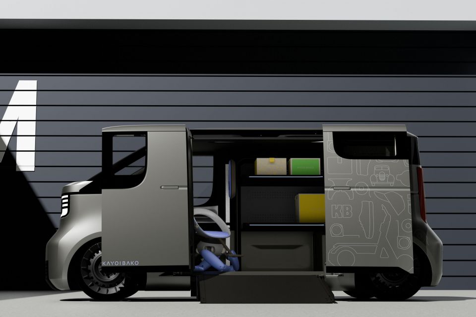 The similarly-sized Kago-Bo also features sliding front and rear doors, but is built for autonomous taxi fleets instead of hauling goods or gear. There’s a sensor pod on the roof to enable self-driving, a spacious cabin with a no driving controls and a sofa-like rear seat.