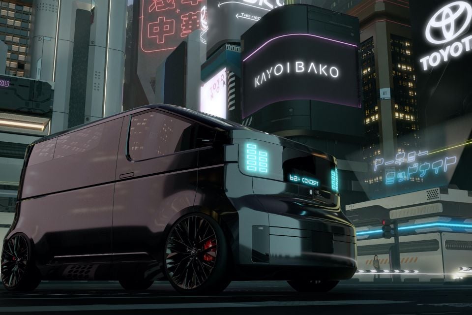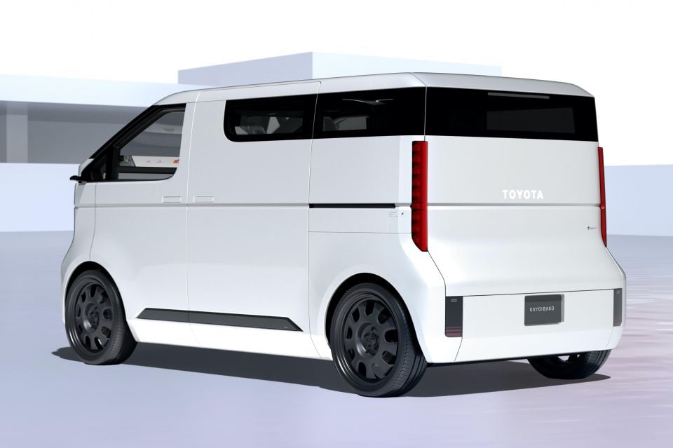 At the rear, the Kayoibako has vertical tail lights with a slim rectangular windscreen and backlit Toyota wordmark.