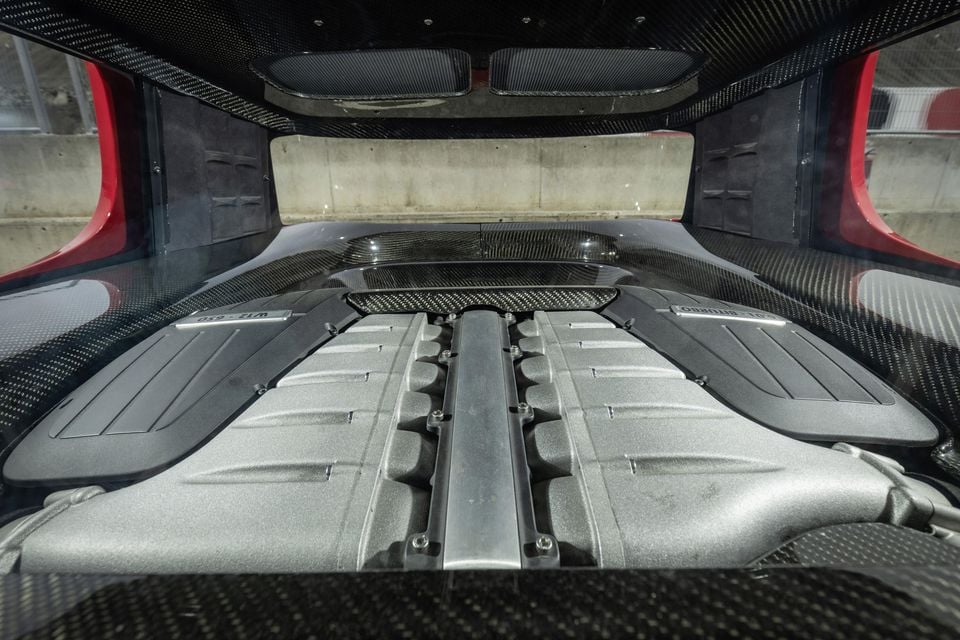 There’s also a stripped back interior with a carbon-fibre dashboard, and almost every conceivable surface finished in microfibre.