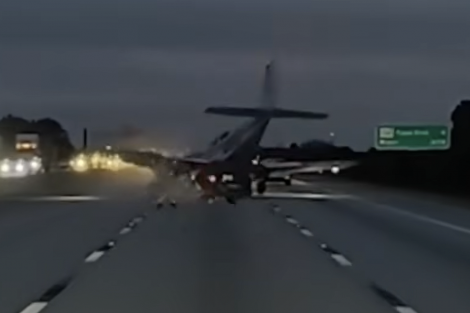 Dash-cam footage captured by another driver, James Coffey, reveals the Beechcraft 95-C55 Baron plane making impact, with a wheel hitting it first before the rest of the aircraft landed atop the Camry.