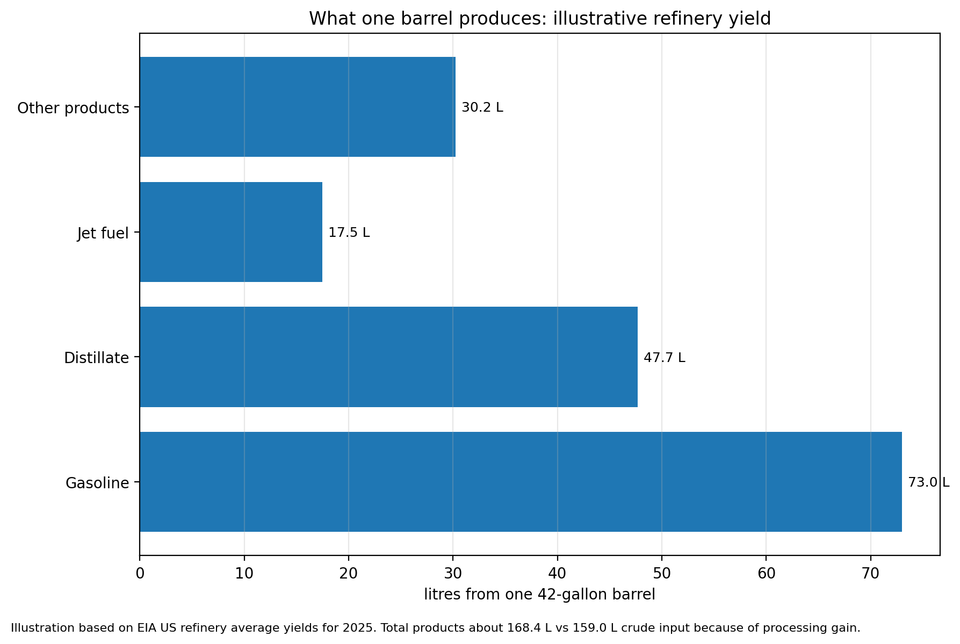 Using the latest US refinery yield data as a clean illustration, the 2025 average barrel produced 45.9 per cent finished motor gasoline, 30.0 per cent distillate fuel oil and 11.0 per cent kerosene-type jet fuel, with total product output equivalent to 105.9 per cent of the original barrel. On a 158.987-litre basis, that works out to roughly 73.0 litres of petrol-like product, 47.7 litres of distillate and 17.5 litres of jet fuel, with the balance made up by other products and processing gain.