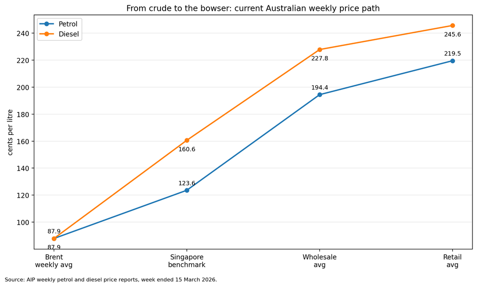 The latest Australian numbers make that obvious. Petrol moves from a Brent equivalent of 87.9cpl to Singapore Mogas 95 at 123.6cpl, then to average wholesale petrol at 194.4cpl and average retail petrol at 219.5cpl. Diesel starts at the same 87.9cpl crude reference, jumps to Singapore Gasoil at 160.6cpl, then to wholesale diesel at 227.8cpl and retail diesel at 245.6cpl.