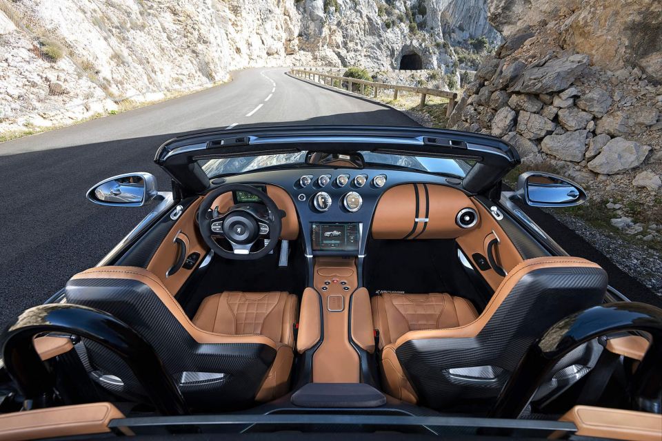 Wiesmann claims the frunk can handle two “carry-on” golf bags. The interior, naturally, features a mix of leather, metal, wood veneers, and carbon-fibre.
