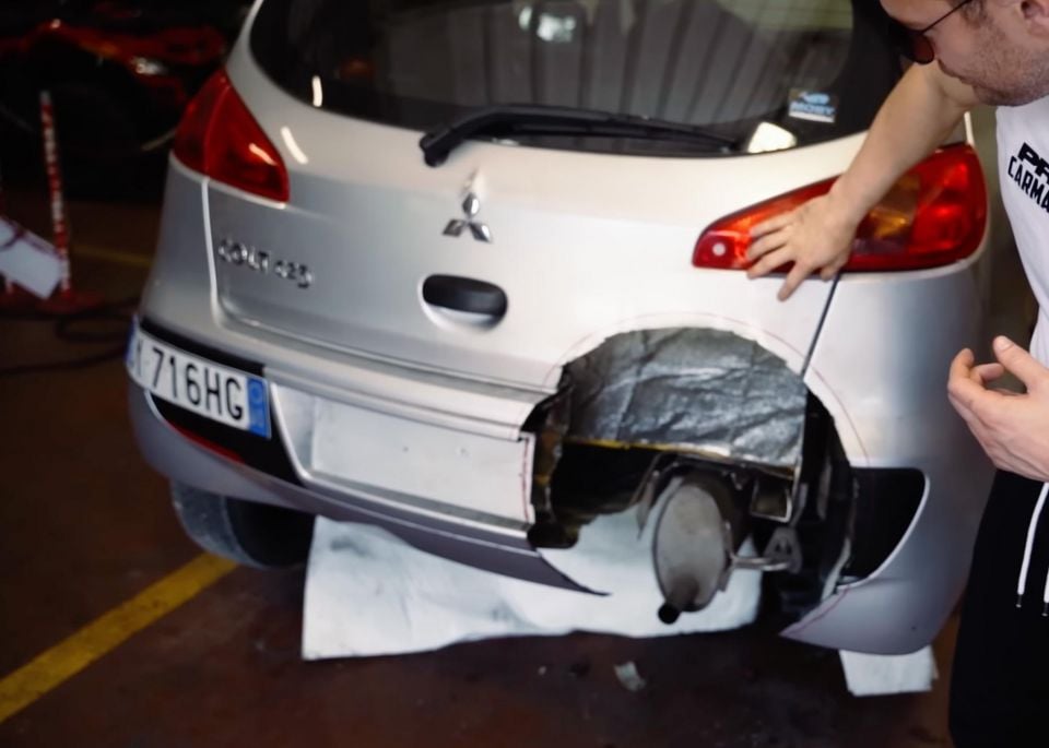 The video starts with the team drafting where the new exhaust would go. The guys used a marker to single out a large circular hole on the right-hand side of the car’s rear. Thanks to a large electric saw, a chunk of the car’s tailgate and rear bumper bar were removed.