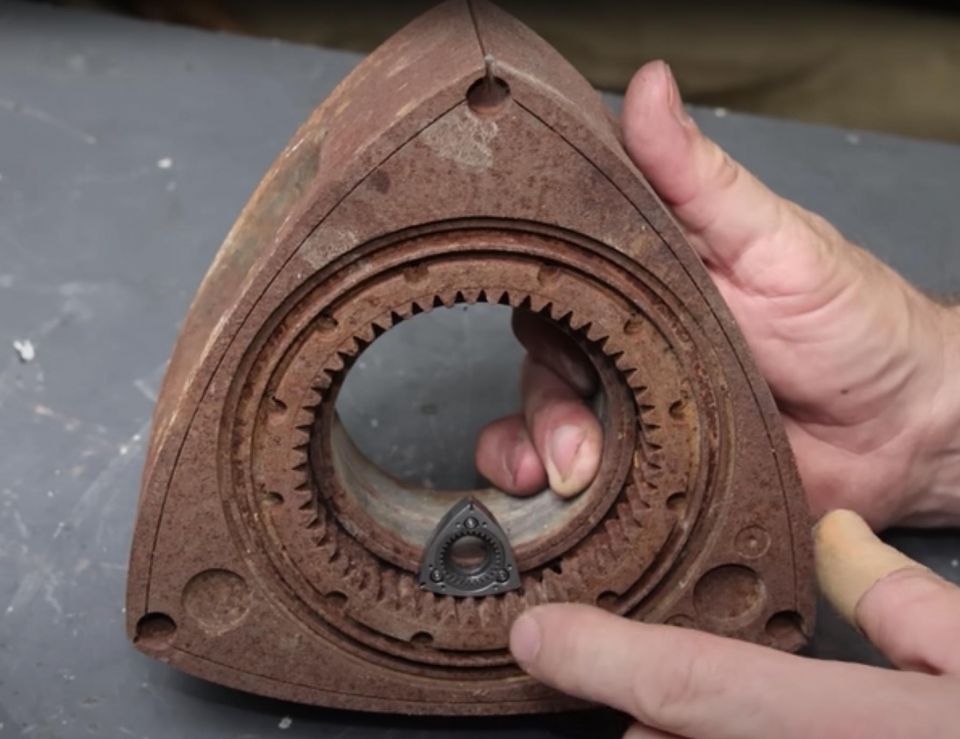 These seals at the three apexes of the triangle are called the apex seals. Apex seals are usually made of metal, and are pushed against the housing by springs. In the video, you can see the tiny apex seals at the tip of a pen, and at one stage he struggles to re-insert the baby apex seal.