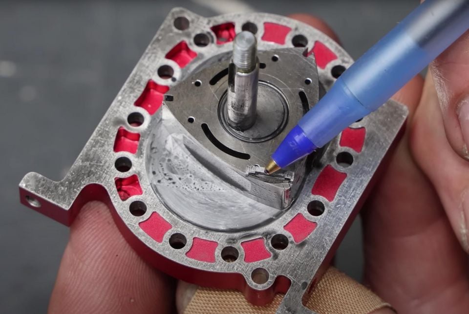 Warped Perception shows us the tiny little apex seals – those pesky little things that usually are the first failing point on a real rotor. In order to keep compression in the chamber, the three tips of the triangular rotor must form airtight seals against the interior casing housing.