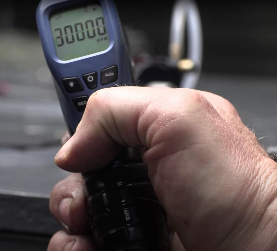At one point in the video, we get to see a laser tachometer zapping the flywheel to show the baby rotor absolutely screaming along at a whopping 30,000rpm!