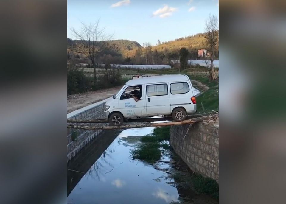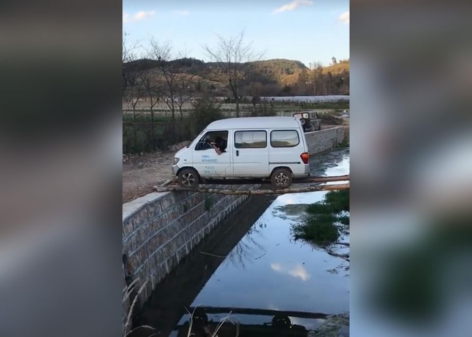 A video posted to YouTube by channel China ODA shows a van attempting to cross a canal using nothing but a pair of tree trunks.