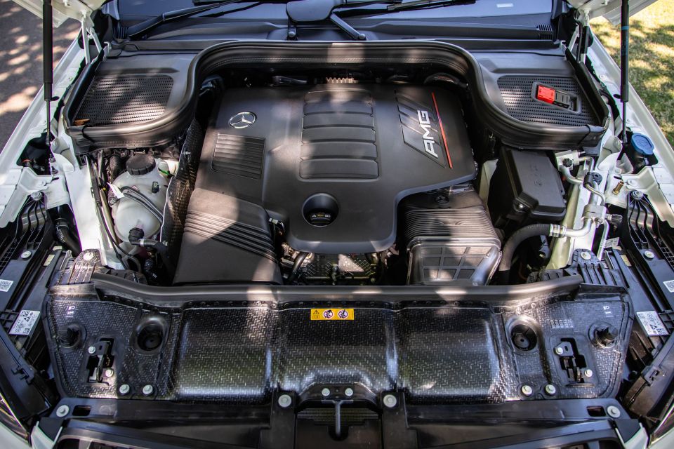 The powertrain is AMG-enhanced, including an extra 50kW/20Nm of output, a performance active exhaust system with dual outlets and an AMG specific Speedshift TCT nine-speed automatic transmission. The all-wheel drive system has an AMG calibration, it rides on air suspension rather than steel springs, and it augments its Active Ride Control with 48-volt active anti-roll hardware.
