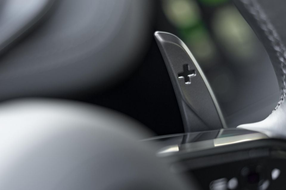 A slightly flat-bottomed steering wheel is fitted, featuring more physical buttons on its spokes, though the highlight is the cold, metal paddle shifters behind.