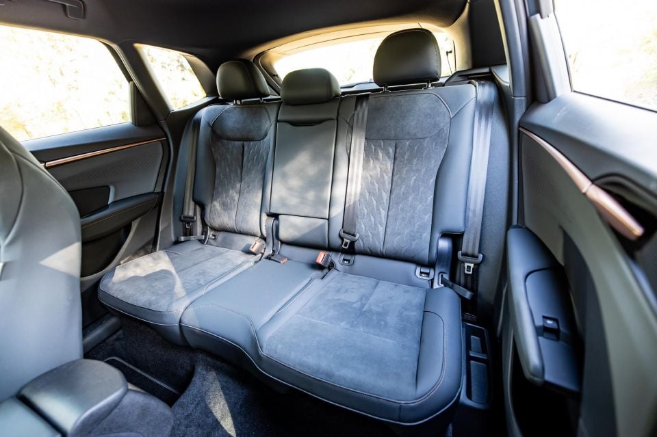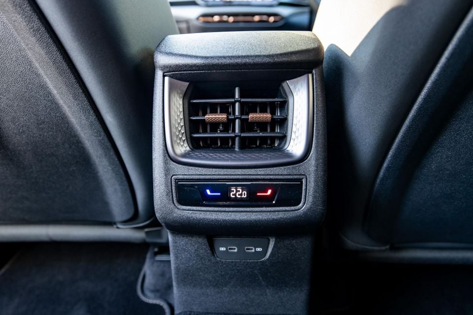 There are directional air vents in the back, plus a fold-down armrest with cupholders, and bottle holders in the doors, but annoyingly no seat back pockets for extra storage – instead you just get hard kick panels.