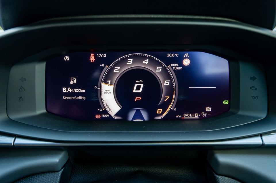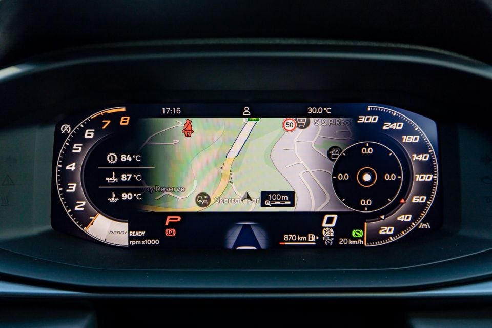 The digital instrument panel in front of the driver is configurable with multiple different view modes, including a map mode and even a lap timer – odd, in this mild-hybrid base model.