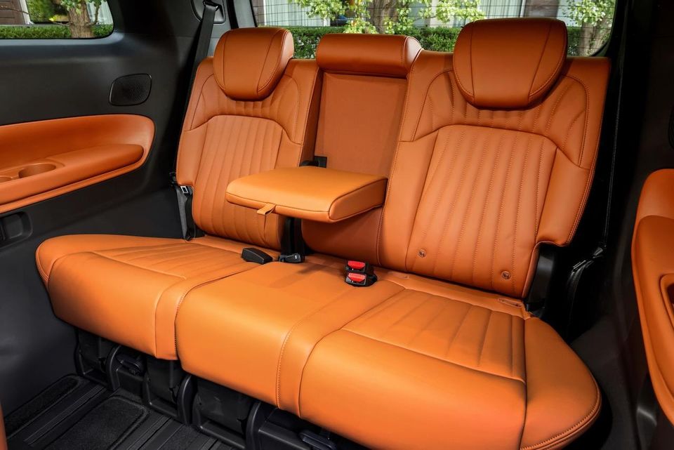 The third-row seats, while trimmed in the same lovely cinnamon leather upholstery, are pretty standard fare, offering okay space and comfort for two adults.