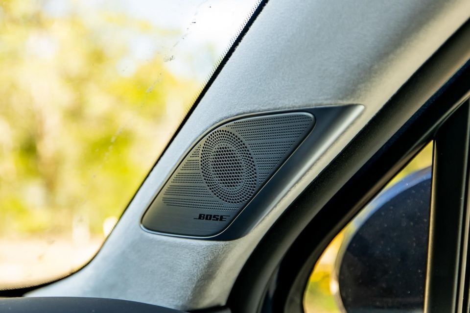 The dashboard with its ‘breaking wave’ style concave finish just looks amazing. And the material trimming is very decent. I love the suede headlining, the Bose speaker covers in the pillars, and the two-tone theme is sexy, too. You can get it with other finishes if you don’t like the cream and navy styling of this cabin.