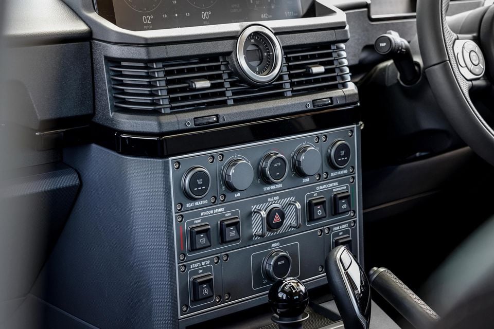 The pop-up glass panels flank an aircraft-style switchboard split into two sections: one with off-road controls and the other with auxiliary switches that you can hook up to whatever 12V accessories take your fancy, whether that be a winch, light bar, or something for the cabin. This is just one of the many ways in which Ineos makes it easy for owners to customise their Grenadier, as is the culture around this type of vehicle.