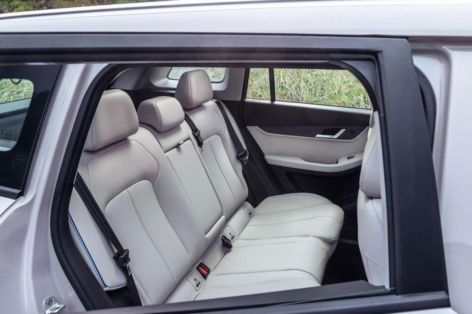 And, on the whole, the J5 EV actually ranks above the majority of sub-premium small SUVs for interior quality. All the panels are screwed together tightly, while most are trimmed in soft-touch plastic or white synthetic leather with contrasting blue stitching. Hard, scratchy stuff is found mostly the belt line, where it’s rarely seen nor felt.