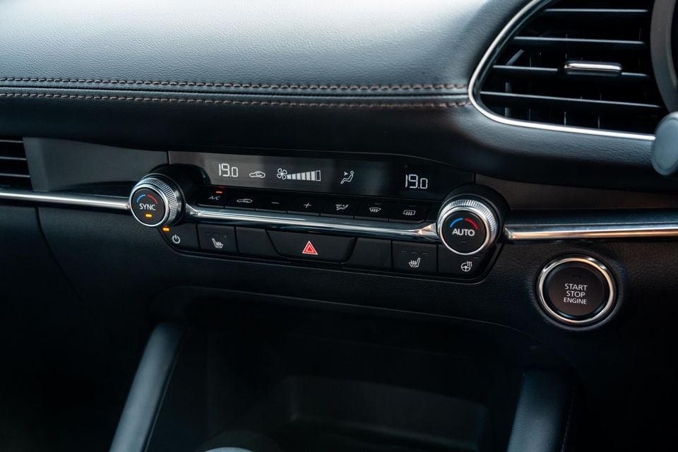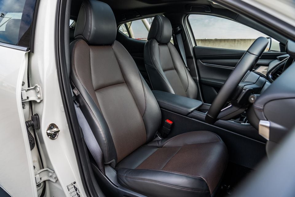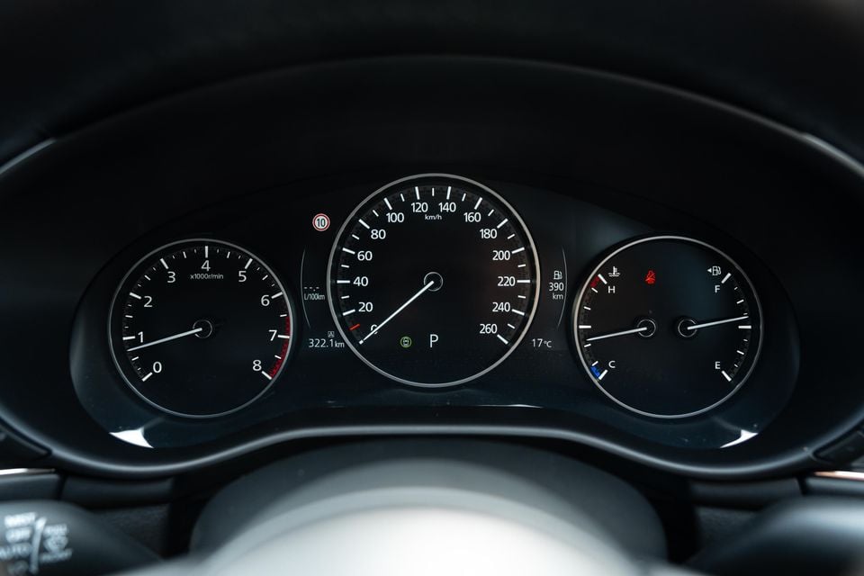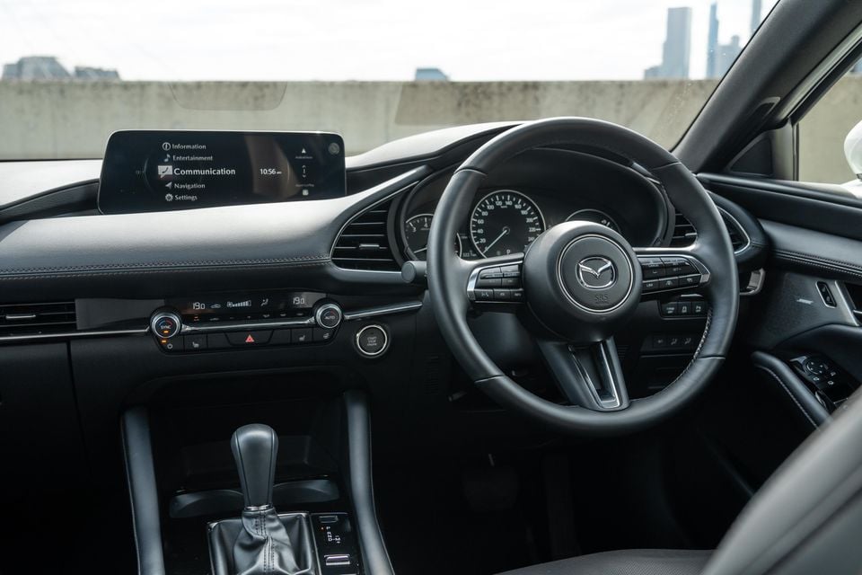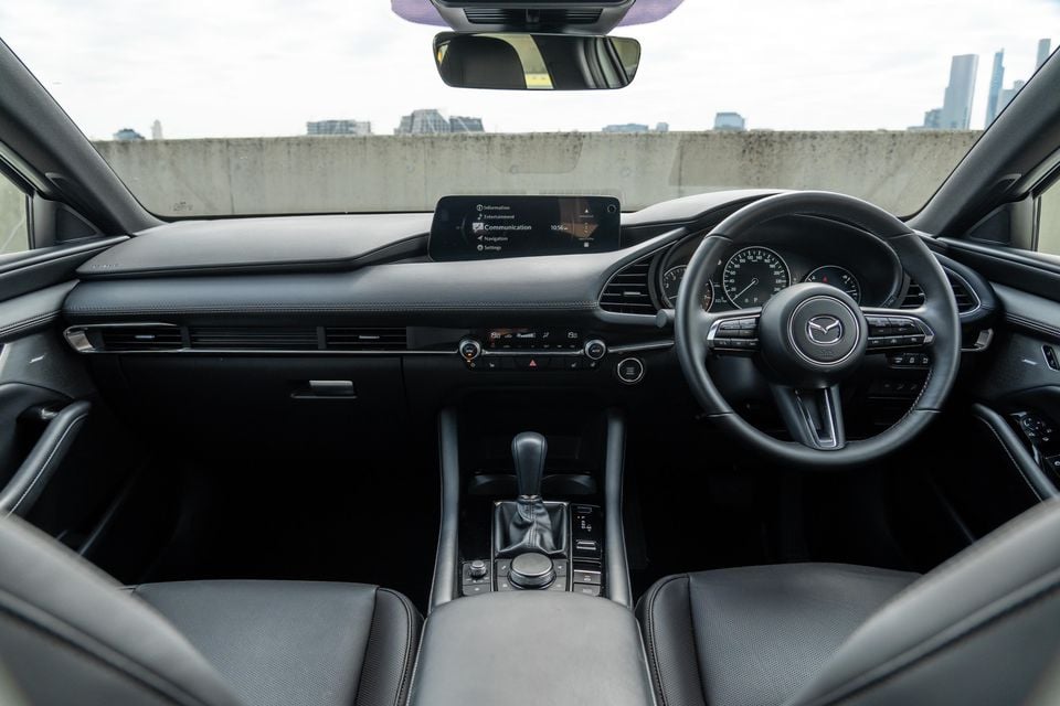 The low roofline, high dashboard, and black headliner contribute to a compact feel from the driver’s seat, but it’d be unfair to call the Mazda 3 cramped. Instead, the cosy feel adds to the premium vibe and echoes the car’s size once you’re on the move.
