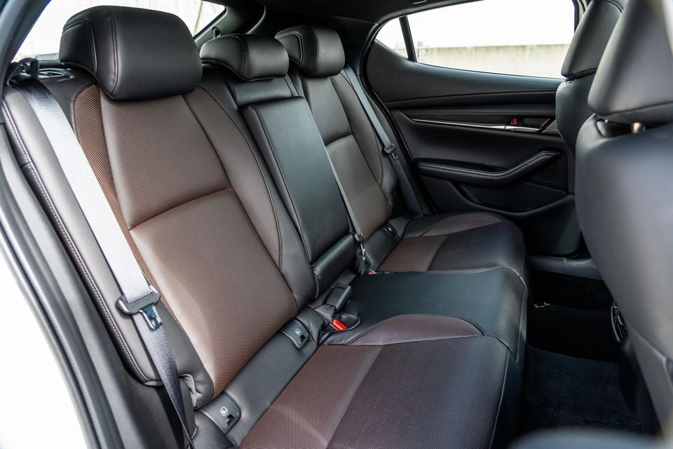 The Mazda 3’s rear doors open to nearly 90 degrees and there’s a decent amount of space when climbing in. The thick C-pillars, high beltline, and dark headliner make the second row feel quite closed-in, but not at all claustrophobic – in fact, it creates a feeling of privacy which aids the semi-luxury vibe.