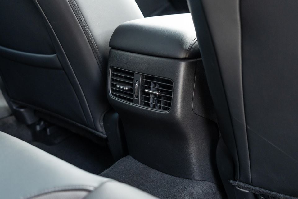 There’s reasonable amount of toe room under the front seats, though the floor is split by a driveline hump. Dual air vents feature on the back of the centre console, but the only other amenities are a fold-down armrest and one seatback map pocket.