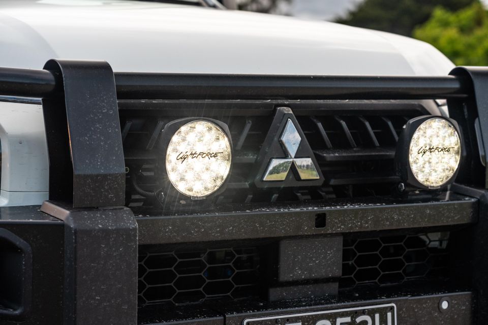 Its utilitarian look is completed by unfinished black plastic door handles and mirror caps, along with a robust black Mitsubishi bull bar adorned with Lightforce spotlights.