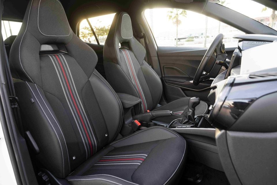 The chief item(s) in its armoury are the deeply sculpted bucket seats up front, complete with integrated head restraints and a five-stripe pattern made up of one central red line flanked by two white and two grey bands.