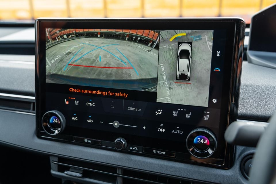 There’s a convenient button on the centre console to bring up the car’s camera views on a whim, and using the surround-view system helps massively when navigating tight carparks.