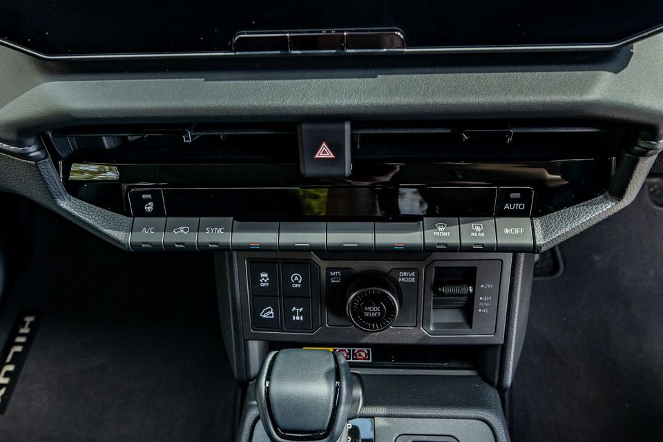 Below the centre screen section there is also a bank of controls for your driving stuff – including hill descent control, rear diff lock, drive mode dial selector and buttons, and your four-wheel drive selector system.