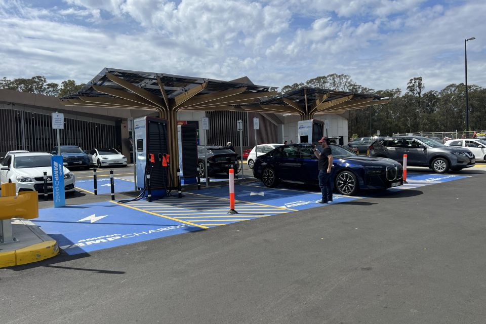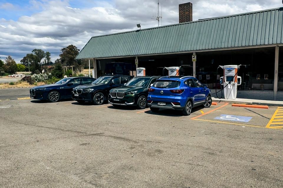 After stopping a couple of times to film some pieces for the video, we made it to Goulburn around 11:30am – expecting to spend around 34 minutes charging. But we found every single charger was in use, including one unfortunate BMW iX3 that wasn’t connected properly and not actually charging, and an MG ZS that was plugged into the 350kW fast-charger.